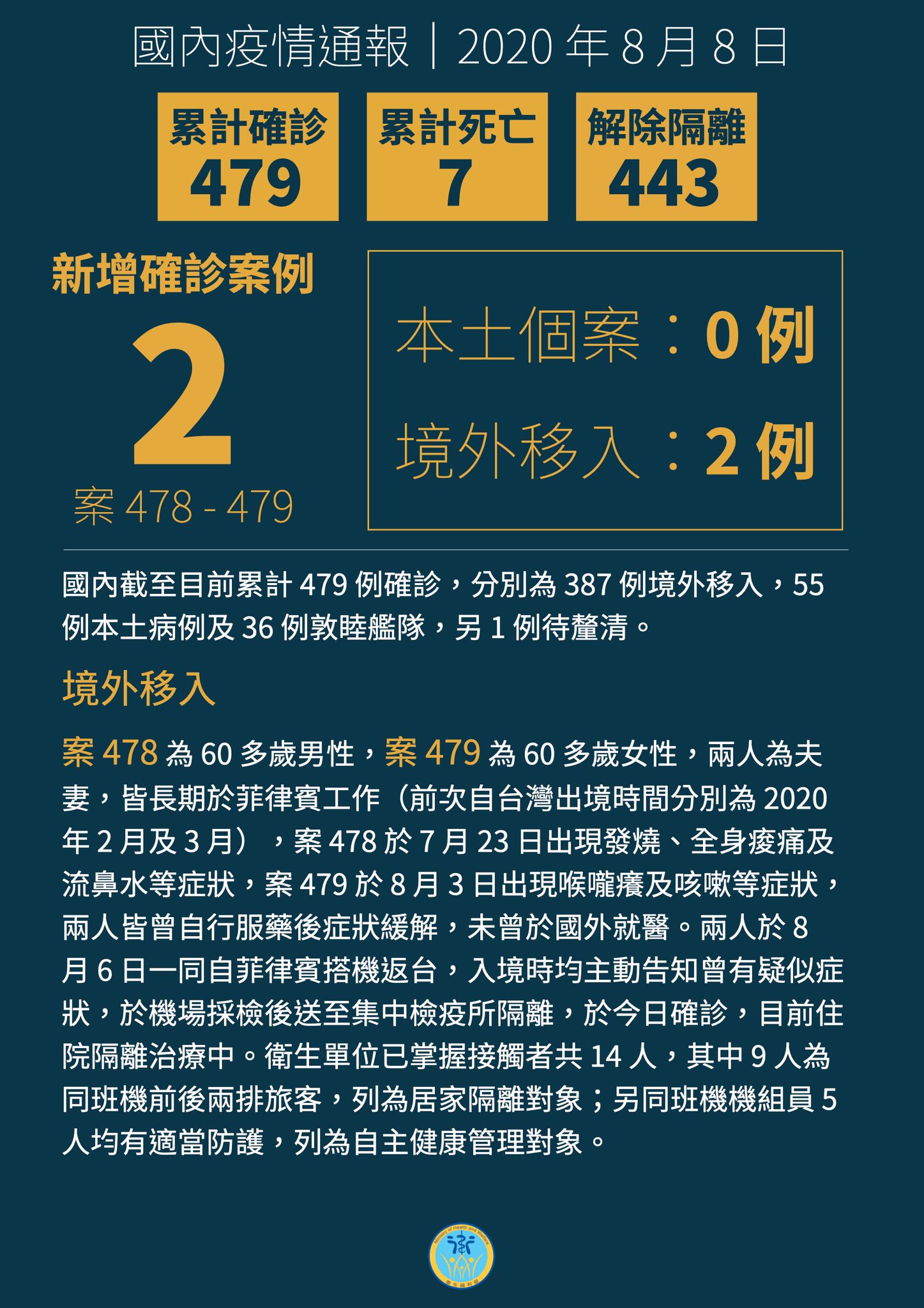 Mohw Of Taiwan على تويتر 衛福編編報報 發文時間 2020 08 08 新增2 例確診個案 皆為境外移入 Https T Co Hl15ed2q63 武漢肺炎 2019ncov 嚴重特殊傳染性肺炎