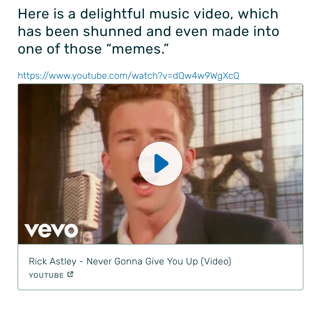 L At T Lte 709 Pm O 100 04 Link Previews Vevo Rick Astley Never Gonna Give You Up Video Youtube Httpsyoutubedqw4w9wgxcq Now Optional Link Previews Are Now Supported For Some Of The Most