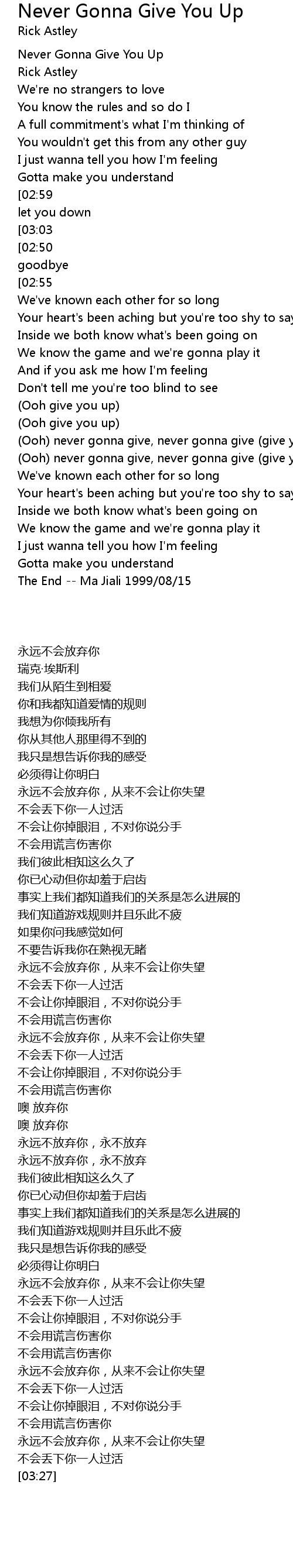 Never gonna give you up lyrics. Never gonna give never gonna give give you up we ve known each other for so long your heart s been aching but you re too shy to say it inside we both know what s been going on we know the game and we re gonna play it i just wanna tell you how i m feeling gotta make you understand never gonna give you up never gonna let you down never gonna run around and desert you never gonna make you cry never gonna say goodbye never gonna tell a lie and hurt you never gonna give you up. We re no strangers to love you know the rules and so do i a full commitment s what i m thinking of you wouldn t get this from any other guy i just wanna tell you how i m feeling gotta make you understand never gonna give you up never gonna let you down never gonna run around and desert you never gonna make you cry never gonna say goodbye never gonna tell a lie and hurt you we ve known each other for so long your heart s been aching but you re too shy to say it inside we both know what s.