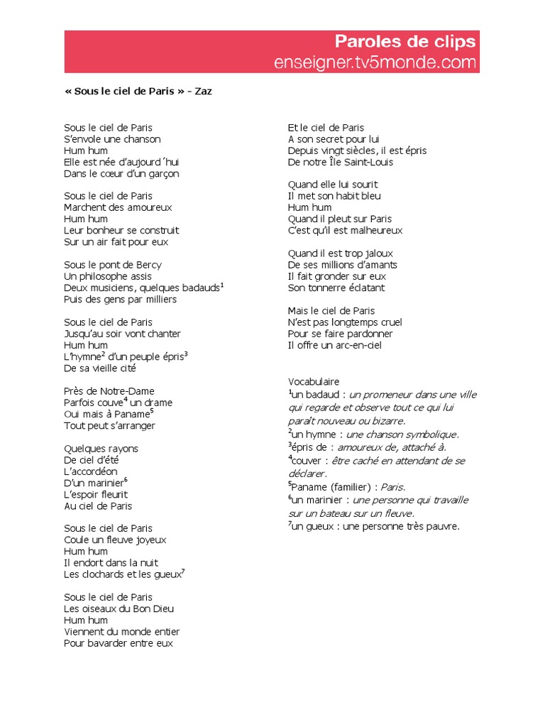 Lyrics Sous Le Ciel De Paris